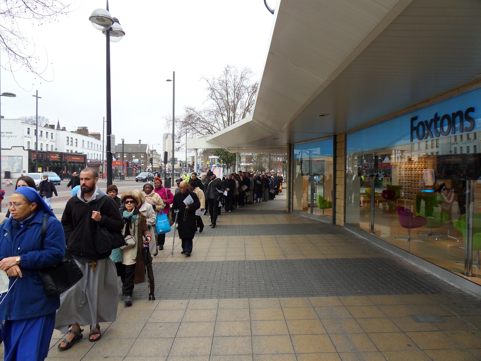 Saturday 10th March saw 170-200 people publicly witnessing to the dignity of human life from conception, and opposing the evil of abortion. The group was made up mostly of local residents from Stratford, East London, as well as 10 Catholic priests including the bishop's representative, 10 religious brothers and sisters, and people coming from as far away as Colchester and Bournemouth. Many people in East London - locals of all religions and none - want Bpas shut down, and replaced by real practical support offered to mothers and fathers in need.